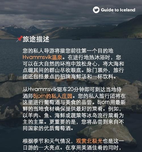 通过本文,我们带你领略了冰岛之旅的奇幻世界。无论是追寻极光、探索火山奇观,还是浸入温泉享受,冰岛都能带给你独特而难忘的旅行体验。相信你已经准备好开始你的冰岛之旅,留下永久的回忆!