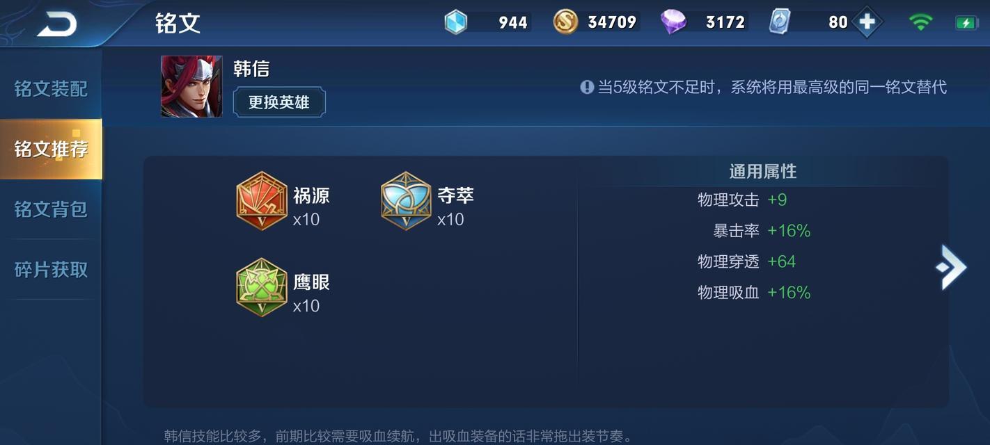 铭文的选择对于韩信来说至关重要。建议选择法术吸血、破甲、法术穿透等攻击类铭文,提高输出能力和生存能力。
